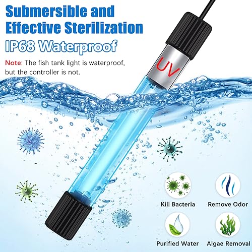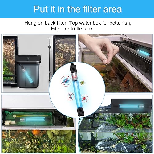 🐟Warm Notice:Please measure the size of your aquarium and compare with the dimension of our product before purchase. Instructions: Please do not watch the UV lamp for a long time, and avoid the UV lamp irradiating the skin. When using the aquarium disinfection lamp, please put it in the filter, or use an opaque plate to separate the lamp from the fish to avoid direct light shining on your fish and harm them, but please make sure that the water can pass through the plate.