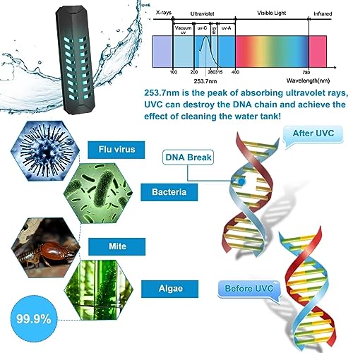🐟Strong Sterilization:Fish tank disinfection lamp can kill up to 99.99% of bacteria!UV-C disinfection works by breaking down certain chemical bonds and scrambling the structure of DNA, RNA and proteins to effectively destroy all microorganisms.