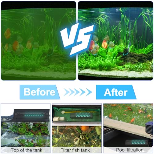 🐟Warm Notice:Please measure the size of your aquarium and compare with the dimension of our product before purchase. Instructions: Please do not watch the UV lamp for a long time, and avoid the UV lamp irradiating the skin. When using the aquarium disinfection lamp, please put it in the filter, or use an opaque plate to separate the lamp from the fish to avoid direct light shining on your fish and harm them, but please make sure that the water can pass through the plate.