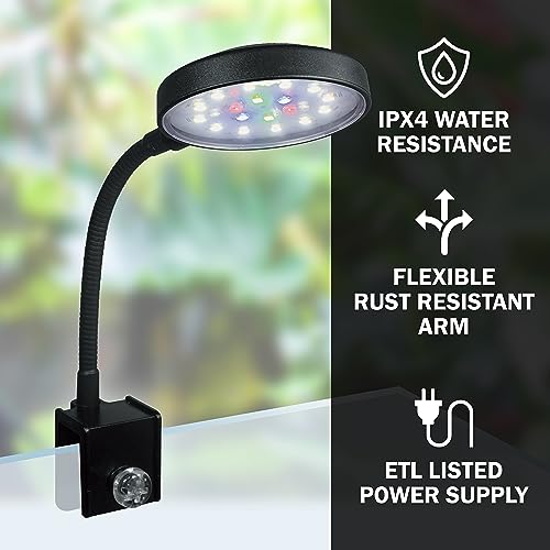 Introducing the Finnex Vivid Petite LED, the ultimate lighting solution tailored specifically for nano aquariums! Specially designed to cater to plant growth, this compact marvel is a game-changer for nano aquariums, including Wabi Kusa aquarium setups and beyond. Immerse yourself in a world of vibrant colors and lush greenery as you witness your aquatic plants flourish like never before. With a touch-control feature at your fingertips, cycling through the six captivating color settings becomes a breeze, allowing you to create the perfect ambiance for your underwater oasis. The flexible and rust-resistant arm offers versatility in positioning, ensuring you can achieve the optimal lighting angle for your precious aquascape. Bringing innovation to the forefront, the Finnex Vivid Petite LED incorporates 650-660nm red LEDs specifically dedicated to enhancing plant growth. Your aquatic flora will thrive under this precisely engineered spectrum, promoting health, vitality, and exquisite aesthetics in your nano aquarium. Safety and efficiency are paramount, and the Finnex Vivid Petite LED doesn’t disappoint. The power supply is ETL Listed, assuring you of its quality and adherence to rigorous safety standards. Consuming only 3.8 watts of power, it remains an energy-efficient choice for eco-conscious aquarists. Sleek, stylish, and seamlessly blending with any aquarium setup, the Finnex Vivid Petite LED features a chic black hood that complements your aquatic masterpiece. Moreover, its IPx4 water resistance ensures durability and protection against splashes and occasional water exposure, guaranteeing longevity for years to come. Illuminate your nano aquarium with brilliance, watch your aquatic plants flourish, and create a stunning underwater world like never before with the Finnex Vivid Petite LED. Embrace the future of aquarium lighting and witness the transformative power of this exceptional product, enhancing the beauty of your aquatic haven with every touch.