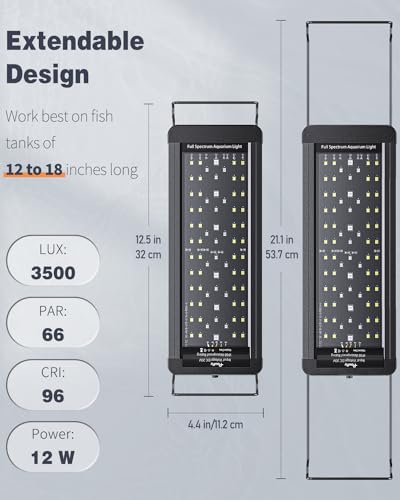 For 12″ to 18″ Tanks: With an extendable bracket (min length: up to 12.5″; max length: up to 21.1″), the LED aquarium light always stays steady on the fish tank. Work best on tanks of 12 to 18 inches long.
