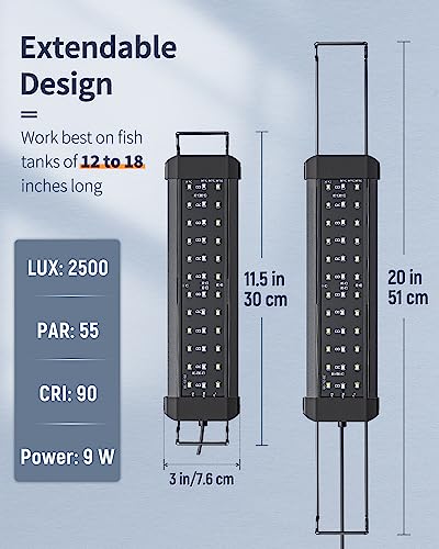 For 12″ to 18″ Tanks: With an extendable bracket (min length: up to 11.5″; max length: up to 20″), the LED aquarium light always stays steady on the fish tank. Work best on tanks of 12 to 18 inches long.