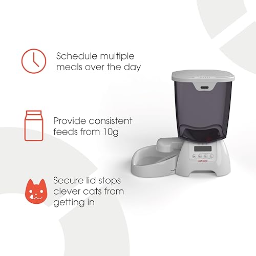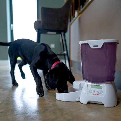 The Cat Mate C3000 automatic dry food feeder for cats and small dogs allows you to Program up to 3 meals a day with portion sizes set in advance by you, minimizing the health risks and costs of overfeeding. The unique feed mechanism ensures accurate and consistent meal sizes from 10 grams (2 teaspoons) upwards and will dispense all popular dry cat and small dog foods. alternatively, the cat mate C3000 will allow meals to be served on demand, or in advance of the programmed times. Additionally, the ‘frequent feed’ mode provides an option for Feeding numerous small meals over the course of the day, ideal for pets with specific dietary requirements such as diabetes. operated by four C cell batteries (not included), always fit good quality Alkaline batteries for long life and reliability. The feeder has a low battery warning icon on the display to give you advanced notice that a battery change is due and good quality batteries should last approximately 12 months. programming is easy following the included written instructions. A quick start video guide is also available online to help you familiarize yourself with the basic options. suitable for both cats and small dogs, the cat mate C3000 feeder features a secure snap-lock Lid and patented self-closing feed nozzle to ensure that your pet can’t feed before the required time. For extra security, the base may be fastened to a wooden Board for increased stability. with a large 3 kilogram (6.5 pounds) capacity hopper, the C3000 can hold enough food for an averaged sized cat for one month. The food hopper, bowl and Lid are all easily removable and are dishwasher safe for easy cleaning. the cat mate C3000 feeder has a three year manufacturer’s guarantee.