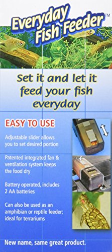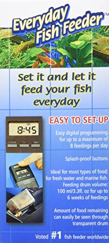 Everyday battery operated, programmable fish feeder ideal for most types of fish food for fresh, water and marine fish. Fits on most aquariums and includes a universal installation clamp. Conveniently and reliably dispenses accurate portions. Easy digital LCD programming for up to a maximum of 8 feedings per day. Manual release button permits feeding outside pre-programmed times. Adjustable slider allows you to set desired portions. Splash proof buttons. Feed drum will not stop in the downward position.