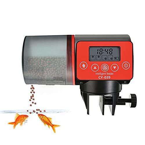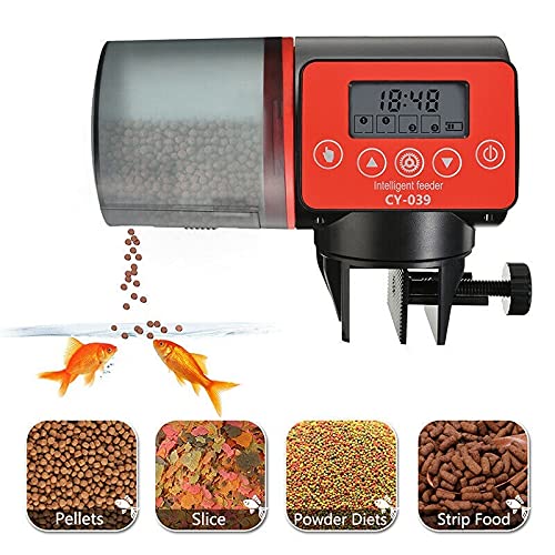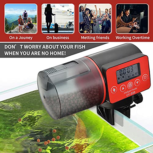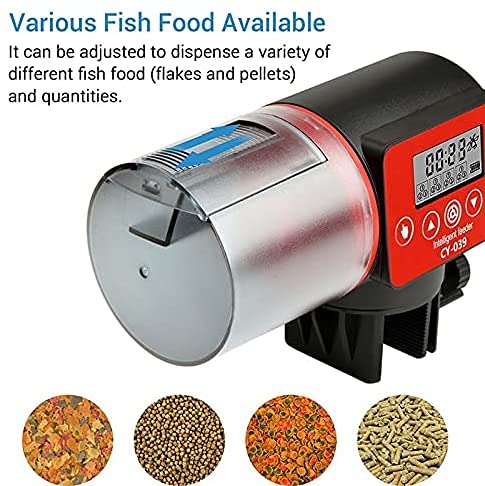 The moisture-resistant hopper keeps fish food dry, won’t get wet or jammed.It accommodates most types of food, including flakes, pellets or crumbles.