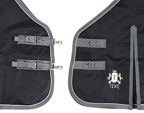 TEKE Deluxe Turnout Sheet/Blanket is made of 1200D ripstop polyester outer, its uncompromising quality and construction include breathable waterproofing to keep your horse warm, dry, and protected, silky nylon lining that’s smooth against his coat, comfortable fleece padding at the withers, generous shoulder gussets for freedom of movement, and a roomy tail flap. Quick-clip front closures make taking this blanket on and off a breeze, and combined with cross-belly surcingles and elastic leg straps, provide a secure, adjustable fit.