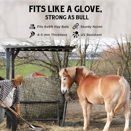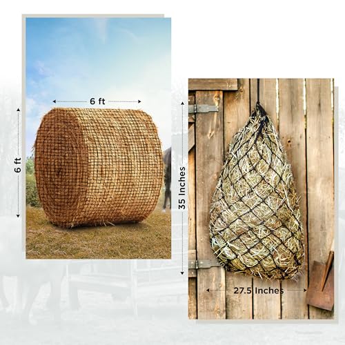 Round Bale Hay Net for Horses – Durable 6×6 Nylon Knotless Slow Feeder Hay Nets for Horses, Fits 6×6, 4×4, 5×5, & 5×4 ft Hay Bales with 2″ Hole, Additional Small Hay Net Included