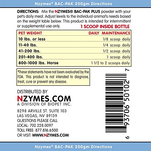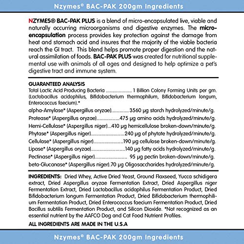 Nzymes BAC-PAK PLUS DIGESTIVE ENzymes AND PROBIOTICS – Supports healthier digestion for pets and horses of all ages. BAC-PAK PLUS assists your animal’s assimilation of nutrients that are typically damaged by heating and processing common to most pet foods. BAC-PAK PLUS delivers increased nutrient uptake and helps bring balance to the GI tract with our perfect blend of “beneficial bacteria” that are necessary for a strong and resilient immune system.