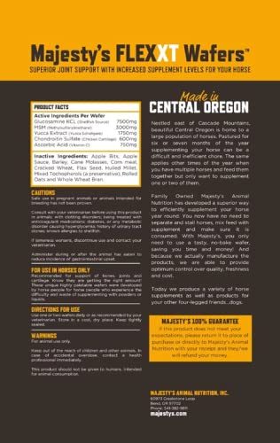 Contains one (1) bag of Majasty’s Flex XT Wafers Superior Horse / Equine Joint Support With Increased Supplement Levels. These wafers are made up of five superior support supplements with 3x more Glucosamine than our original Flex Wafer. All of these supplements combined together produce an easy-to-use supplement wafer that increases range of motion and reduces inflammation.