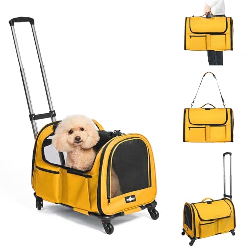 Large Cat Carrier with Wheels, Foldable Rolling Pet Dog Carrier with Wheels and Big Pocket, Cat Carrier Travel Bag for 2 Cats Dogs Under 30 lbs for Outdoor Vet Visits, Yellow