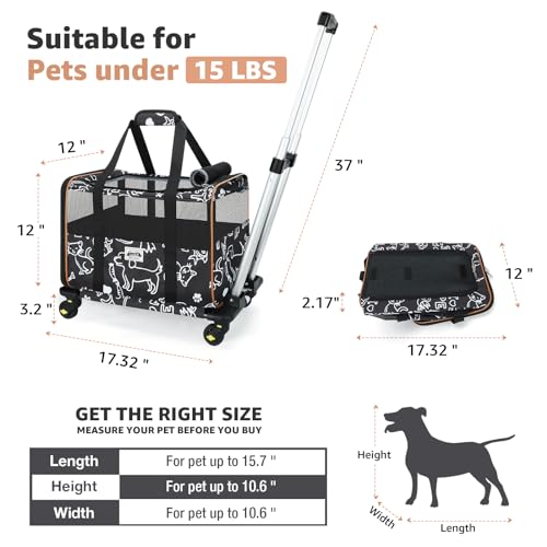 Dog Carrier Airline Approved: Meets MOST TSA standards, the rolling dog carrier fits under most airline seats when wheels are removed. Pet carrier size: 17.32”L x 12”W x 12″H, accommodating pets up to 15lbs.