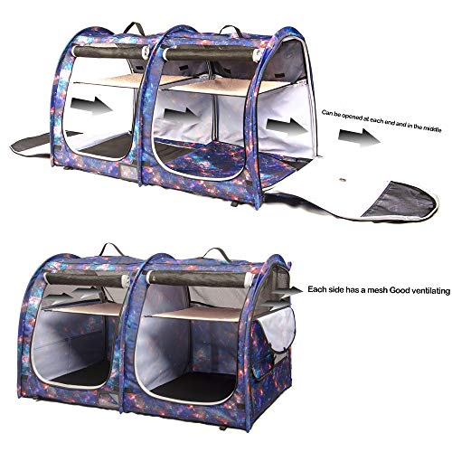 ✔️RELIABLE MATERIAL – The fabric outside cage is made of thick Oxford cloth to prevent pets from scratching and tearing, and it is durable. the frame is made of strong glass rod, which will not deform after repeated use. In addition, there are two front and rear doors with zippers, and the inner floor is made of high-strength mesh, which ensures air permeability. The outer layer is a curtain of Oxford cloth, both of which can be rolled up or pasted through the burr on the bottom and the cage.