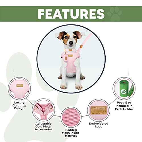 Luxury Dog Banks Harness Set in Light Pink – Light Pink Corduroy Padded Harness, Collar, Leash and Poop Holder Set Fits Small, Medium and Large Sized Dogs Free Poop Bag (XS)