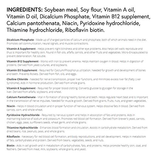 INGREDIENTS:Flaxseed Meal, Soy Flour, Soybean Oil, Dicalcium Phosphate, DI-alpha-tocopheryl-acetate (Source of Vitamin E), Biotin, D-Calcium Pantothenate, Choline Chloride, Niacin, Pyridoxine Hydro-chloride, Retinyl Propionate (Source of Vitamin A), Cholecalciferol (Source of Vitamin D), Vitamin A Acetate (Source of V