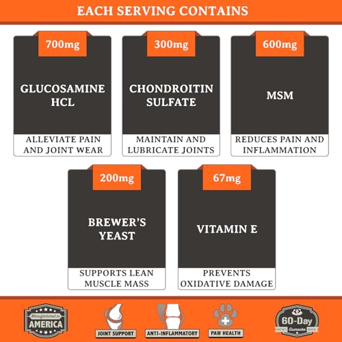 100% SAFE – We love our dogs that is why we only source premium ingredients like Glucosamine, Chondroitin, MSM, Vitamin E, and real beef liver powder for flavor and added B Vitamins. Alpha Dog Nutrition’s Free Range Joint Supplement for Dogs is free of any harmful additives or fillers, only the best for your best friend.