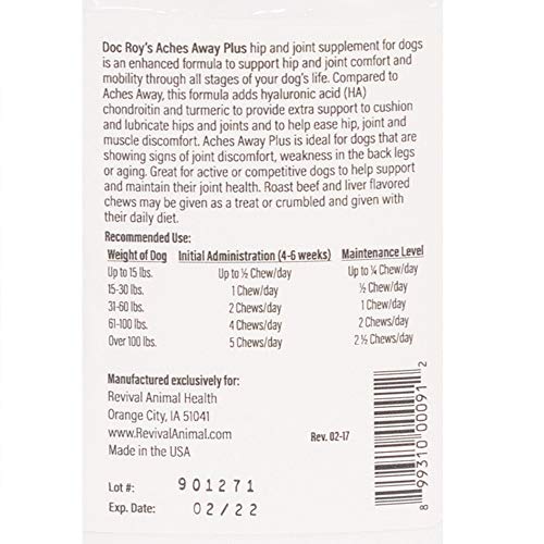 Revival Animal Health Doc Roy’s Aches Away Plus- Premium Hip & Joint Support- for Medium & Large Dogs- 90 ct Regular Soft Chew