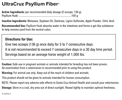 Horses that graze on sandy ground may ingest sand and dirt that may accumulate in the intestinal tract causing stomach discomfort and digestive issues. Psyllium seed husks combined with water form a gelatinous substance that flows through the horse’s intestinal tract, helping to decrease sand and dirt accumulation in the gut. For best results, use UltraCruz Equine Psyllium Fiber Supplement for horses as a monthly supplement to aid in the intestinal cleansing and to support normal digestive function in your horse. For horses that cannot digest molasses or do not need extra sugar, we recommend using our UltraCruz Equine Pure Psyllium for horses, which provides the benefits of psyllium supplement, while containing 100% pure psyllium seed husk.