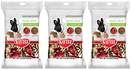 Kaytee small pet Treat Sticks with Superfoods add a nutritious punch for a guilt-free experience. Treat sticks provide a fun way to add healthy and tasty enrichment to your pet’s diet. Rabbits, guinea pigs, and hamsters benefit from the nutritious punch of vitamin C, antioxidants, fiber, and Omega 3s.