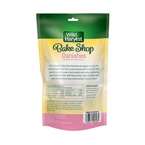 Wild Harvest bird and small animal products offer a full assortment of nutrition and interactive engagement products for your daily bird and small animal needs. We’re committed to providing your birds and small pets with a complete diet containing the vitamins, minerals and nutrients they need for a happy, healthy life.Wild Harvest Bake Shop Danishes with artificial cherry flavor are a great-tasting, fun and delicious treat for small pets, including guinea pigs, hamsters, gerbils, adult rabbits and other small animals. The crunchy texture and irresistible taste provide variety to your small animal’s diet and stimulates their desire to chew. Wild Harvest Bake Shop Danishes are sure to become your small pet’s new favorite treats. Feed 1 treat daily. The resealable bag keeps these treats fresh. Small animals can make great family pets. They enjoy interacting with people, they’re generally easy to care for, and they’re not too expensive to keep. The experts at Wild Harvest brand strive to provide small-pet owners with all of the tools they need to enrich and improve the lives of their furry friends.
